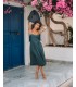 Midi dress, made of matte khaki satin, slightly creped, lace closure at the back and zipper.