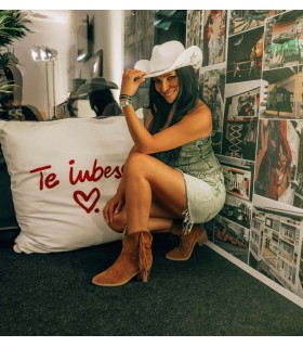 Beige suede ankle boots, accessorized with a removable buckle and chain.