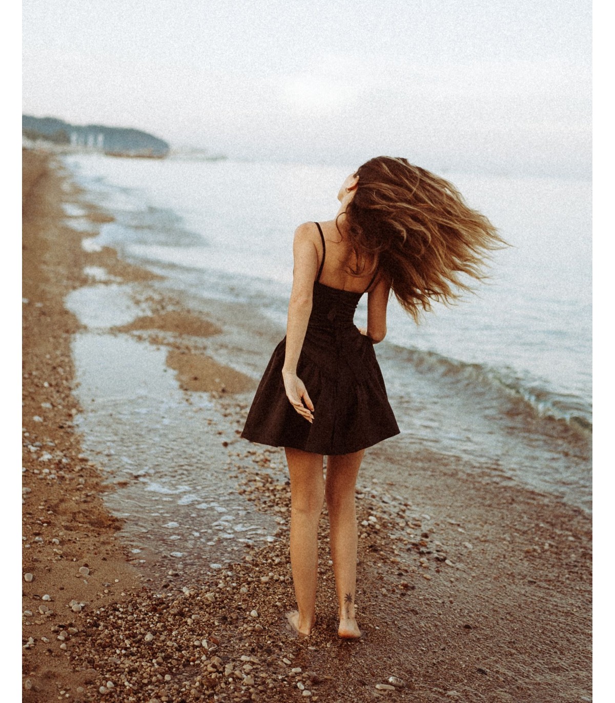 Short black satin cotton dress with cord.