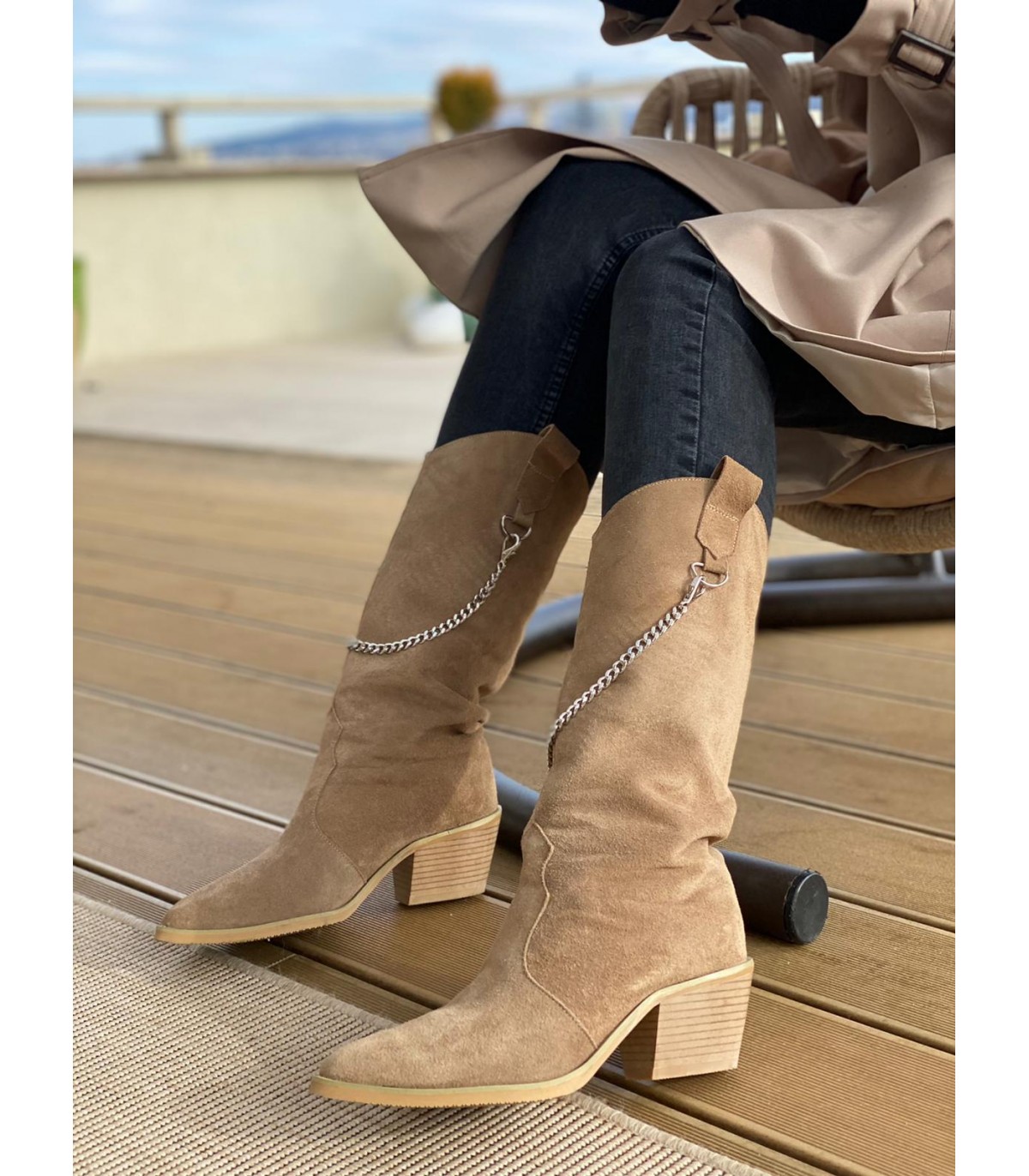 Long boots made of greige suede. The boots are made of natural leather inside and out. Boot height: 40cm - Heel height "4.5 cm *made to order, in 6-10 working days Foot sole length: Size 35 - 22.8 cm Size 36 -...