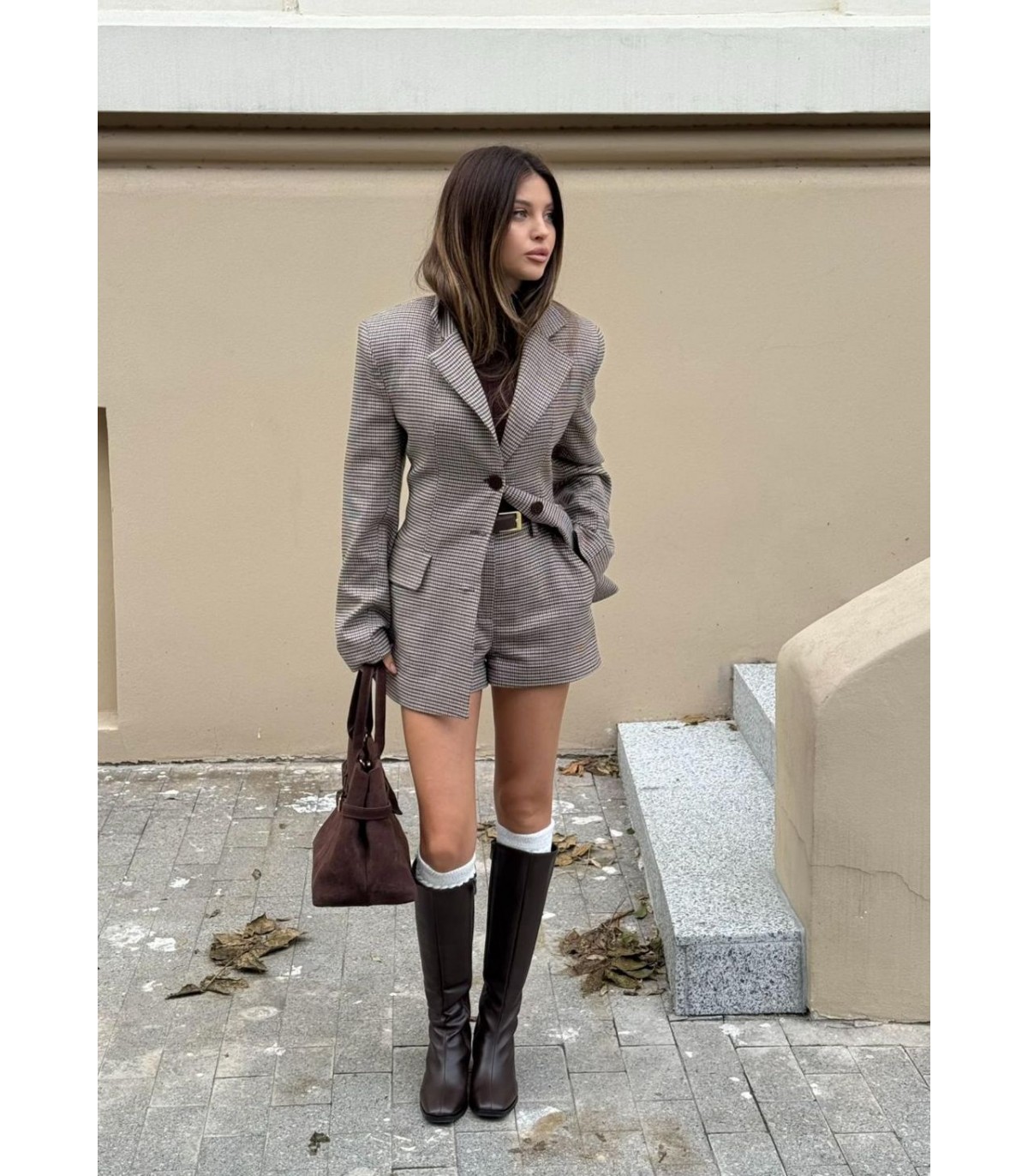 For a complete Parisian look, we recommend wearing the suit with the Mocha Bag (made of brown genuine leather).