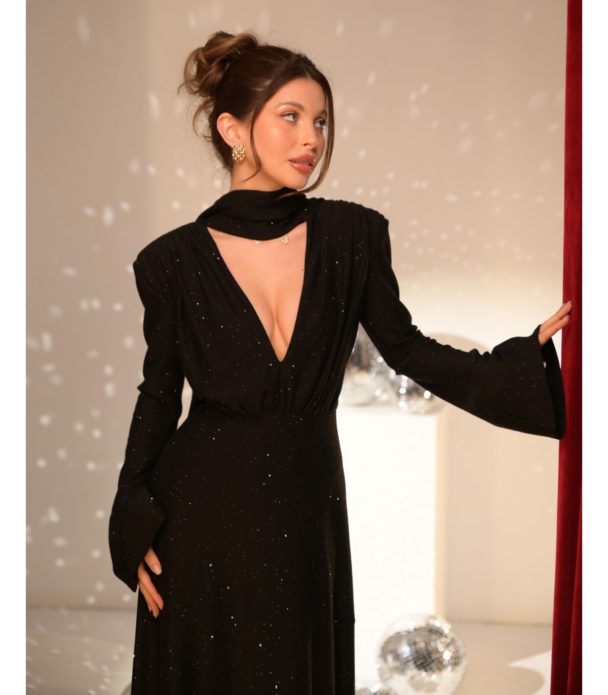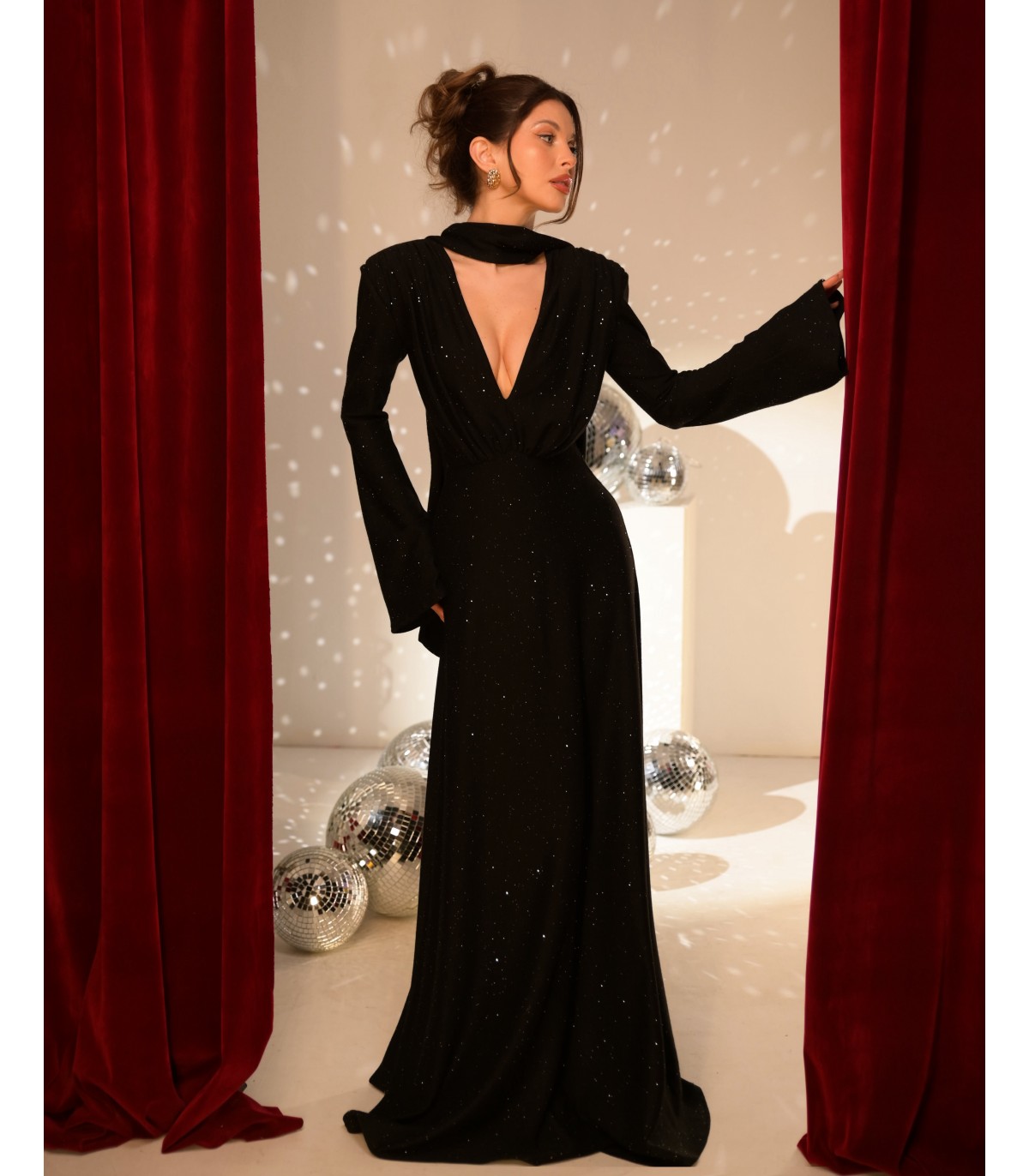 Long black knit dress with silver glitter