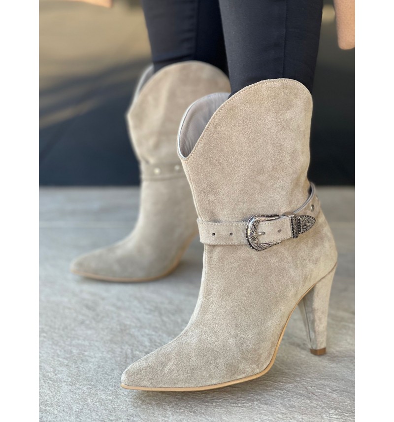 Short boots, with loose suede heel, with detachable buckle.