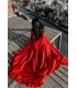Long flowing dress, made of red satin, with thin straps and frills at the bottom.