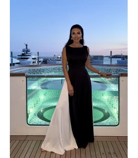 Black barbie suit, consisting of vest with collar and skirt with apparent pockets, made of white poplin.