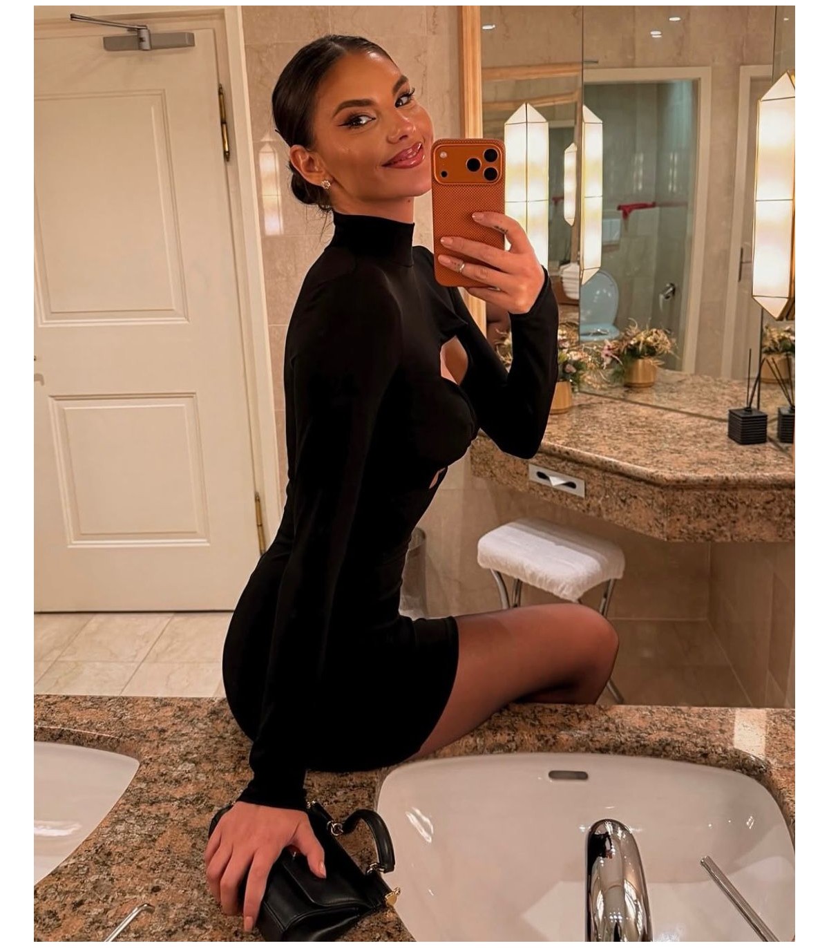 Short black lycra dress with cut-outs on the bust.