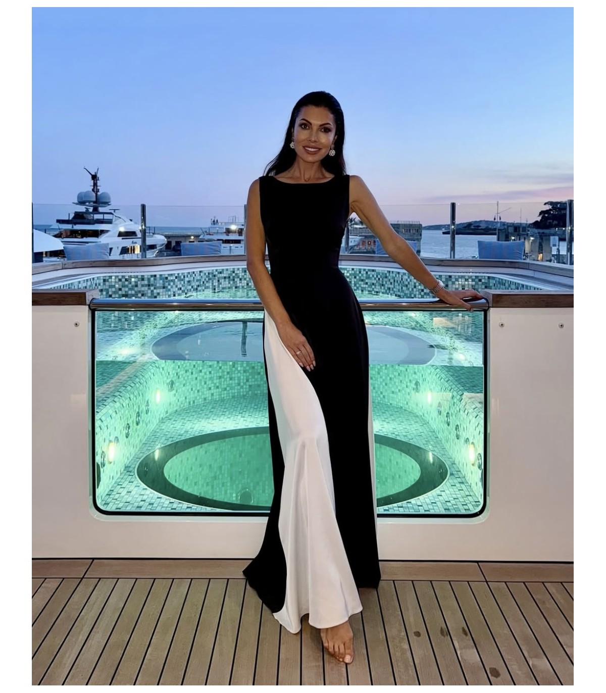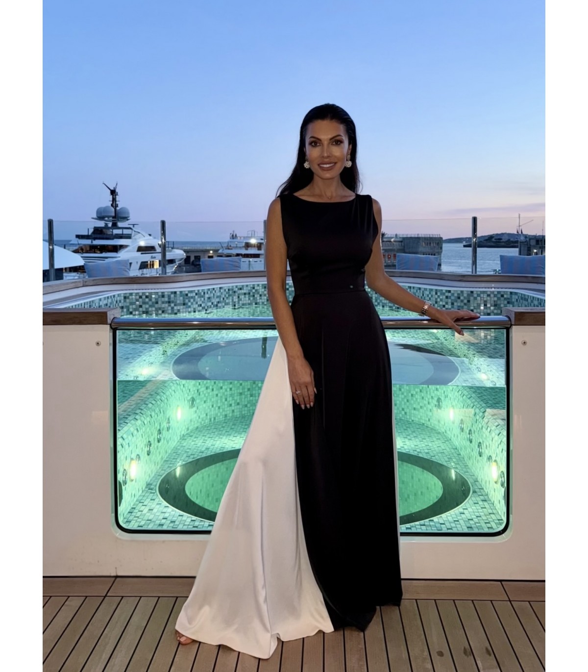 Long black licra dress with flared sleeves. The back has a deep cutout.