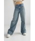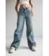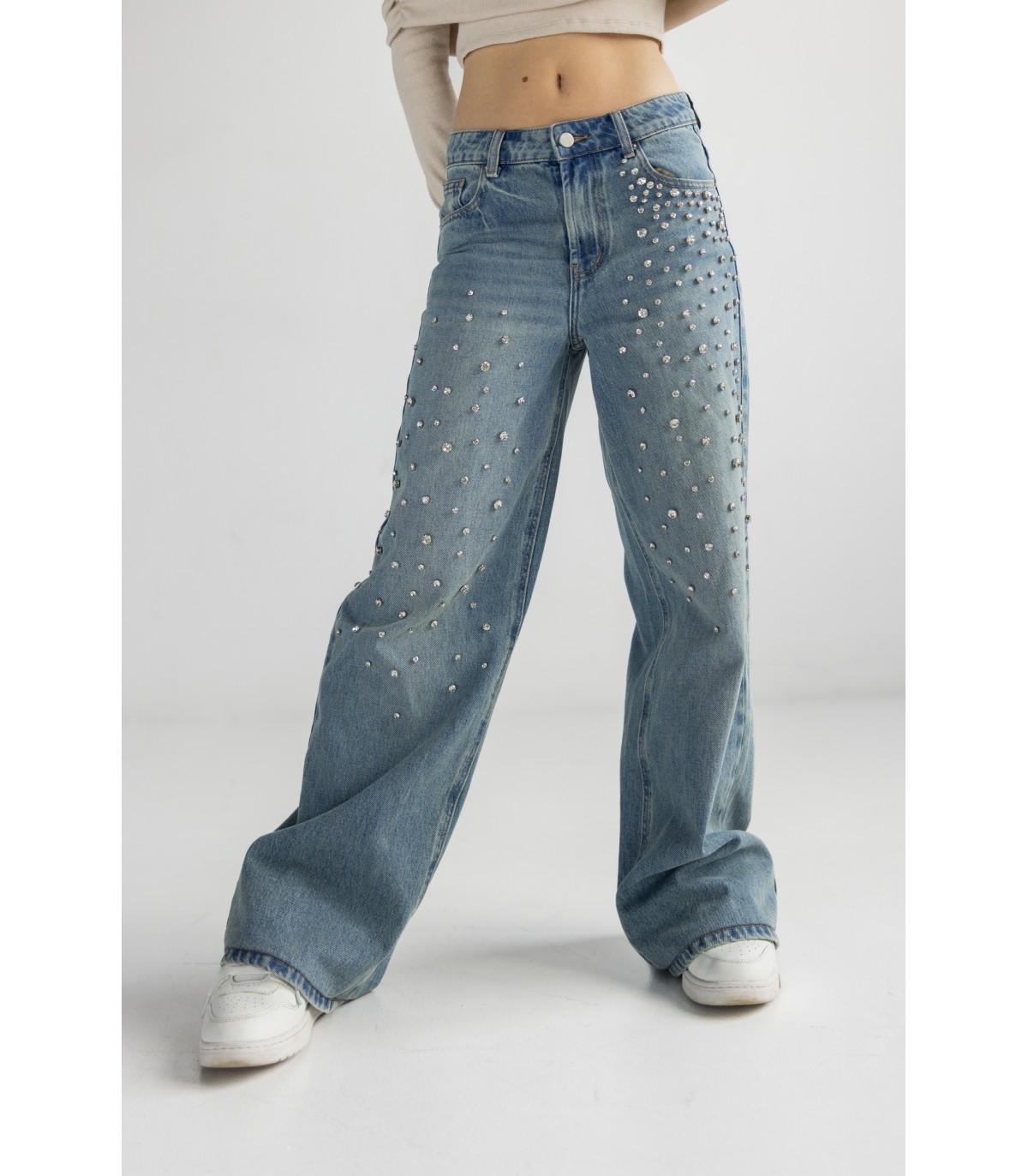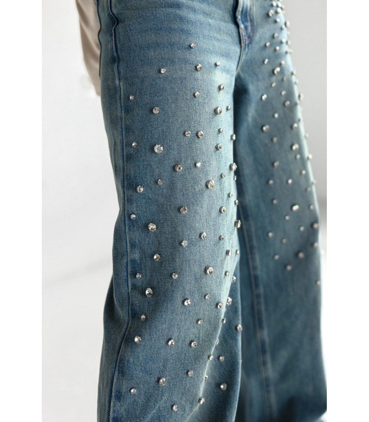 Blugi largi (tip wide leg), cu talie medie, acesorizati cu strasuri de diverse dimensiuni, doar pe fata blugului (pe spate eticheta din piele naturala)