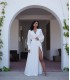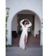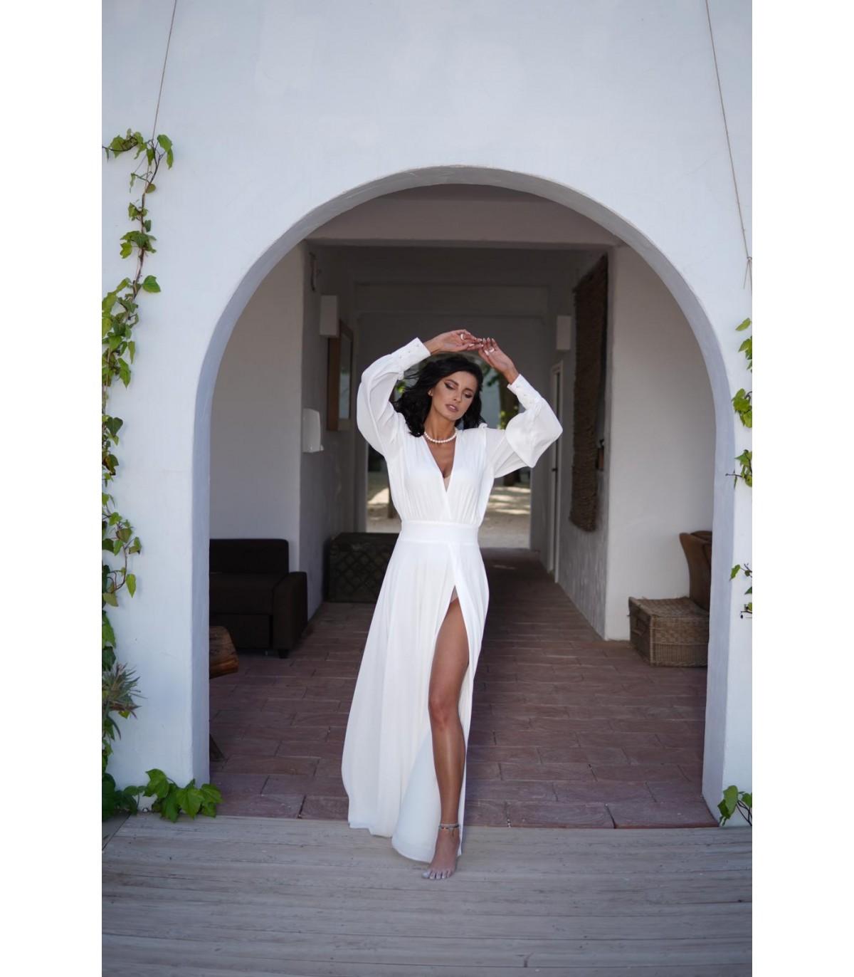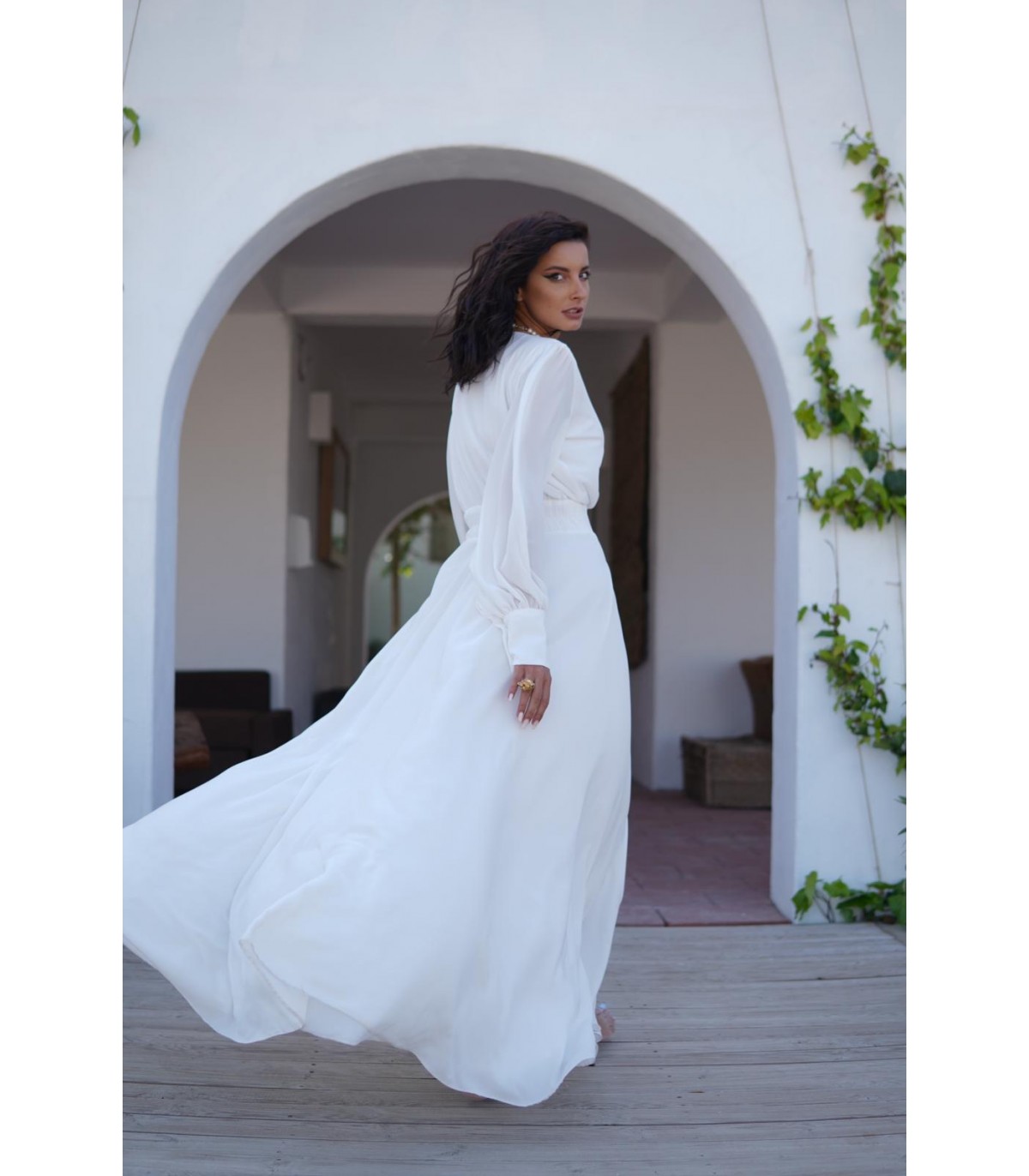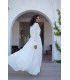 Rochie lunga din voal alb,l talie putin eleastica, slit lateral. Rochia este captusita integral si se inchide cu fermoar lateral.