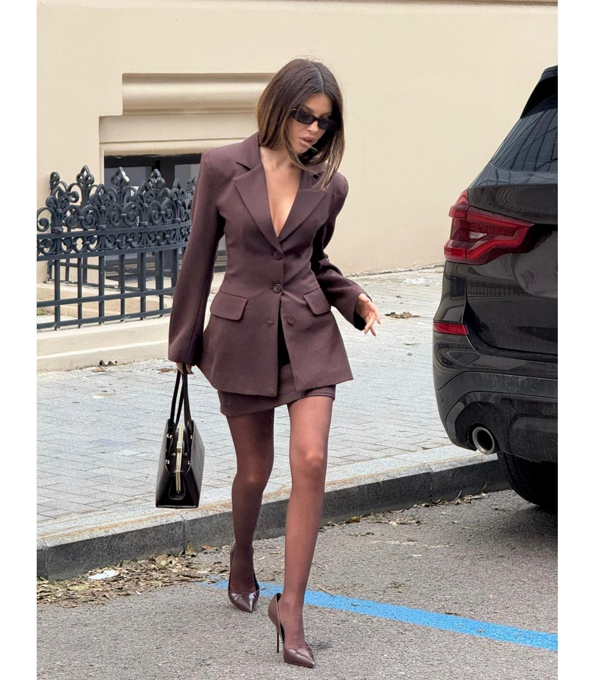 Pentru un look complet parisian, iti recomandam sa porti costumul cu Geanta Mocha (din piele naturala maro).