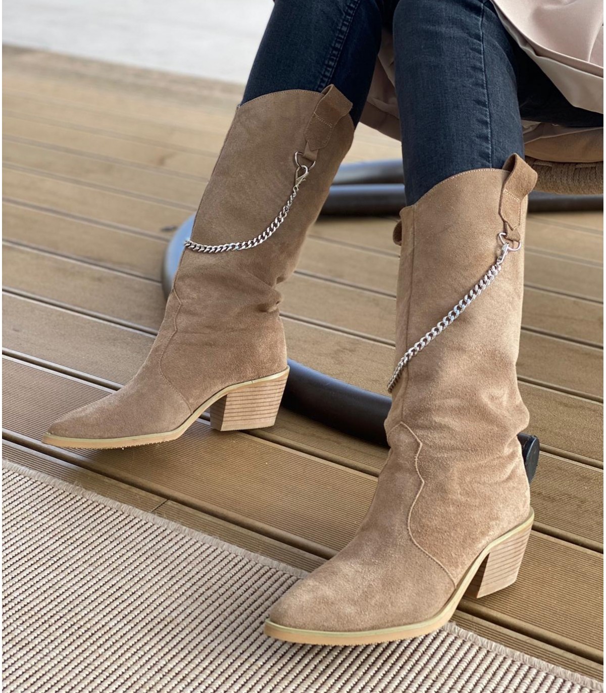 Ciocate lungi din piele intoarsa bej inchis, talpa bej si cu lant detasabil. Cizmele sunt realizate interior exterior din piele naturala.