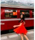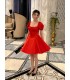 Rochie scurta, din satin mat rosu, închidere cu șiret la spate si fermoar in lateral.