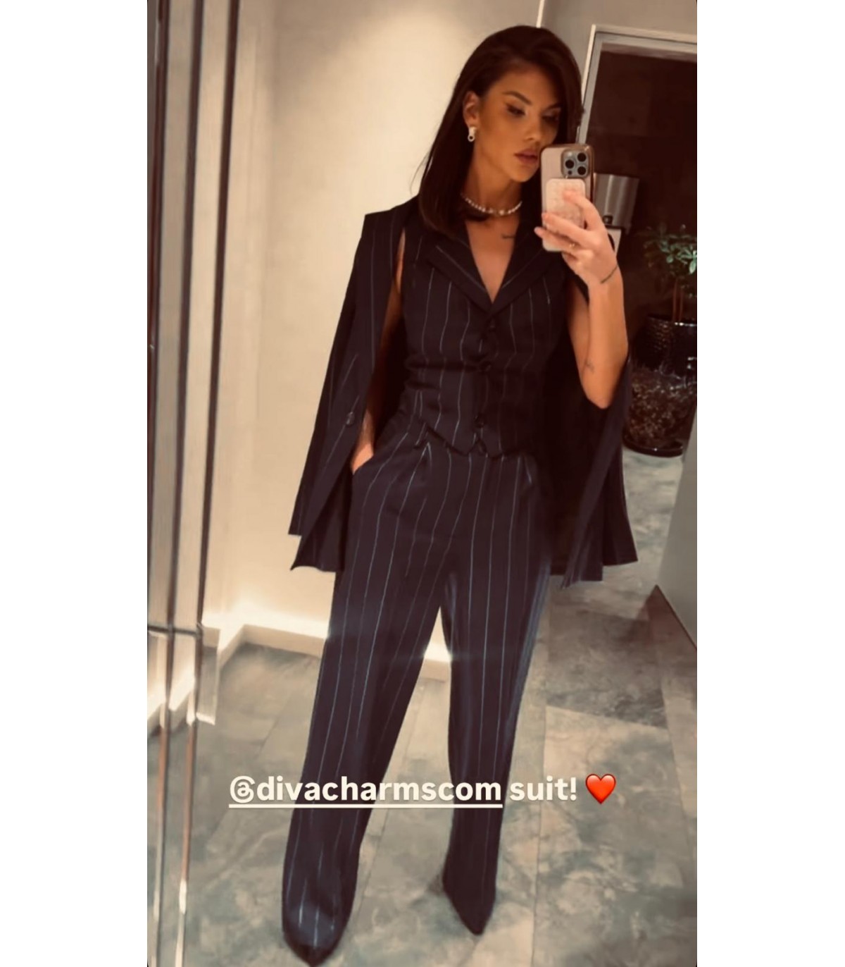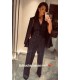 Costum din stofa NEAGRA cu dungi fine argintii, format din sacou, vesta cu guler si pantalon.