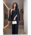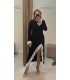 Rochie midi din bistrech negru, cu sliț lateral si cu volane din dantela chantilly