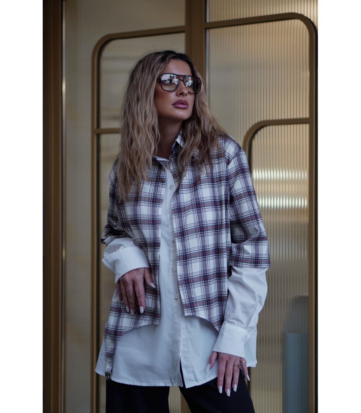 Camasa oversize, dubla, parte alba din poplin de bumbac si [parte cadrilata cu terminatii cu accesorii metalice