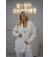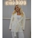 Cradigan tricotat, cu margini cu franjuri. Se petrece parte peste parte si se poate inchide cu cordon.